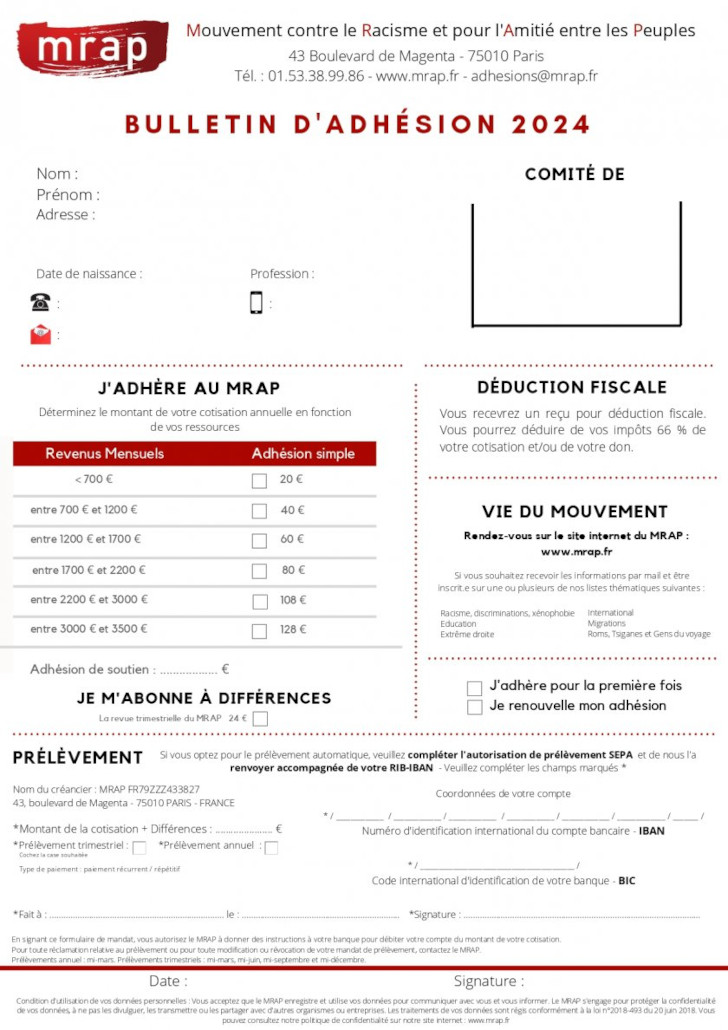 Vous pouvez retourner le bulletin d’adhésion ci-dessous au comité local (2bis rue Albert-de-Mun, 44600 Saint-Nazaire) ou au siège national du MRAP (43 boulevard Magenta 75010 Paris).