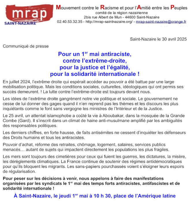 Accueil > le MRAP > 1er mai : Pour un premier mai antiraciste et de solidarité