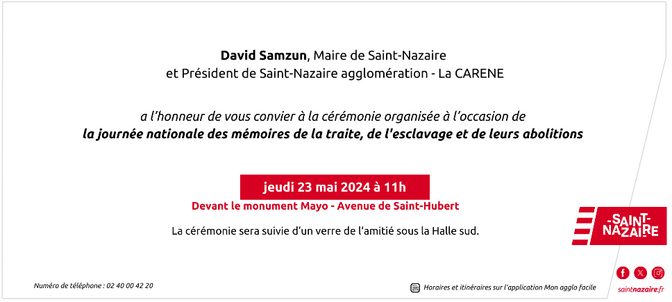 A l’invitation de Monsieur le Maire de Saint-Nazaire, la cérémonie des mémoires de la traite, de l’esclavage et de leurs abolitions se tiendra le jeudi 23 mai à 11h devant le monument de Jean-Claude Mayo.