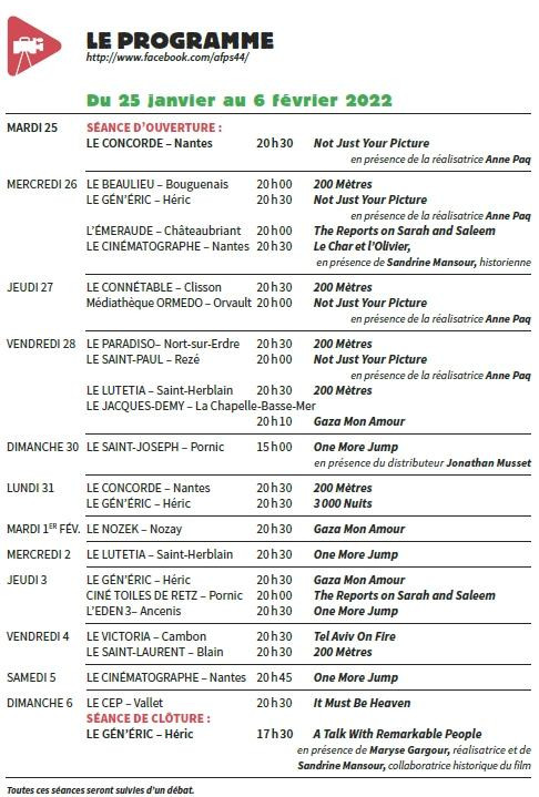 Le cinéma palestinien exprime la vitalité d’un peuple dont la tragique condition n’empêche pas la joie de vivre. A travers les fictions ou les documentaires proposés nous entrons dans ses douleurs, ses espoirs, sa mémoire de plus de 70 ans de conflit, sans oublier son humour et son sens de l’autodérision.