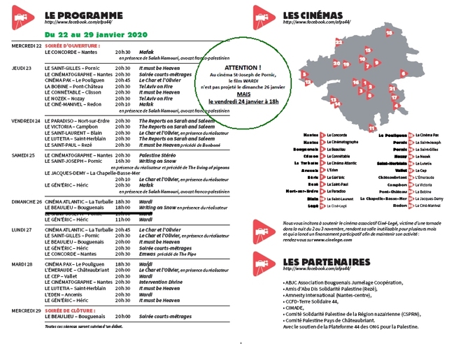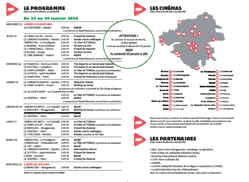 Du 22 au 29 janvier 2020 l’Association France Palestine Solidarité organise la 4ème semaine du film palestinien en Loire-Atlantique, dans 22 cinémas du département.