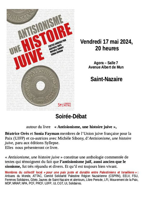 Le Collectif nazairien pour une Paix juste et durable entre Palestiniens et Israéliens est heureux d’accueillir à Saint-Nazaire Béatrice Orès et Sonia Fayman, membres de l’Union juive française pour la Paix (UJFP) et co-autrices avec Michèle Sibony, d’Antisionisme, une histoire juive et de vous inviter à cette soirée.