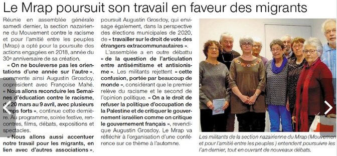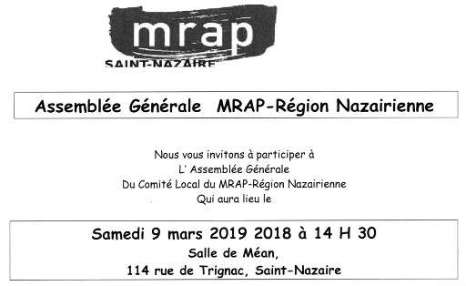 Le comité de la région nazairienne du MRAP tiendra son assemblée générale annuelle le samedi 9 mars 2019 à la salle municipale de Méan-Penhoët (Saint-Nazaire).
