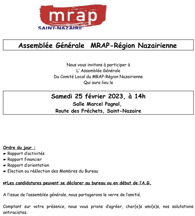 Le samedi 25 février 2023, le comité du MRAP de la région nazairienne a tenu son assemblée générale annuelle, et réaffirmé son engagement contre le racisme et les discriminations.