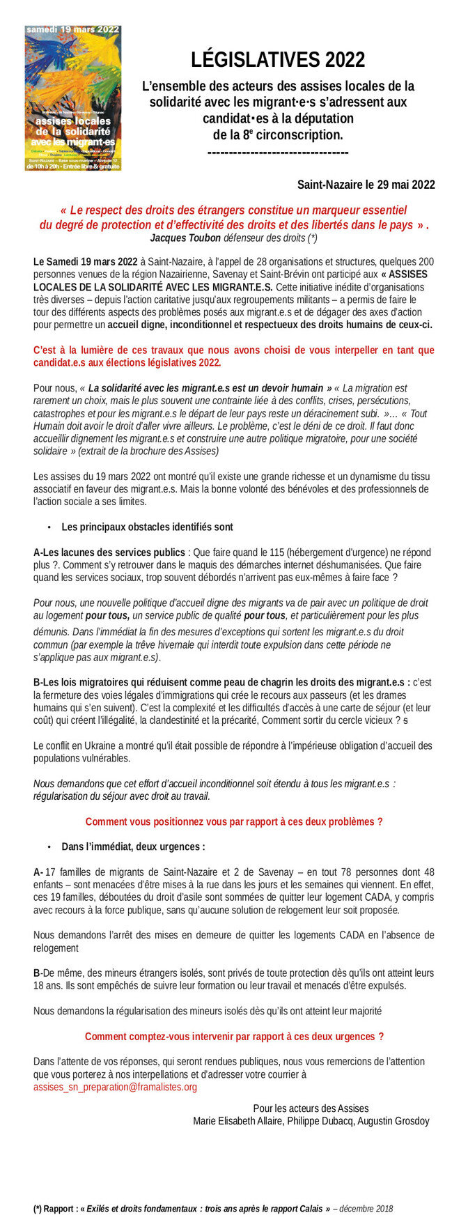 Les acteurs des assises locales du 19 mars 2022, de la solidarité avec les migrant·e·s s’adressent, dans le document ci-dessous, aux candidat⋅e⋅s à la députation de la 8è circonscription.