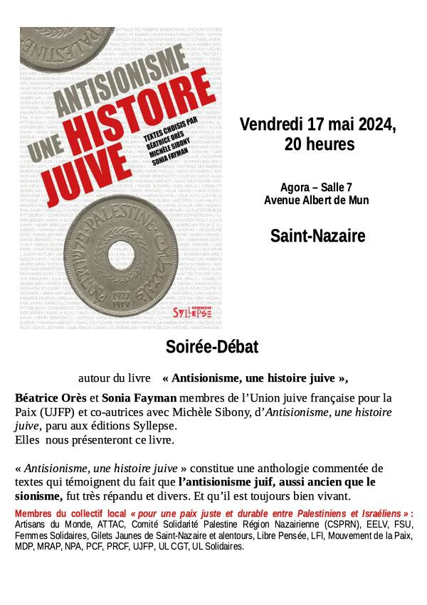 Le Collectif nazairien pour une Paix juste et durable entre Palestiniens et Israéliens est heureux d’accueillir à Saint-Nazaire Béatrice Orès et Sonia Fayman, membres de l’Union juive française pour la Paix (UJFP) et co-autrices avec Michèle Sibony, d’Antisionisme, une histoire juive et de vous inviter à cette soirée.