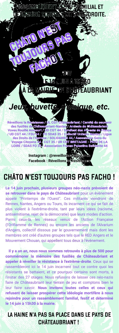Le Collectif de Châteaubriant appelle à un Rassemblement festif, familial et déterminé contre l’extrême droite samedi 14 juin à 13h30, devant la mairie de Châteaubriant.