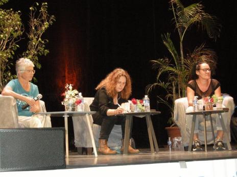 Marie-Elisabeth Allaire (MRAP) animant la table ronde avec Vanina Rochicciolli (GISTI) et Sophie Dru (CIMADE)