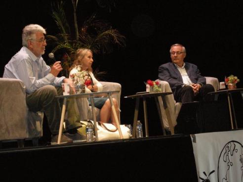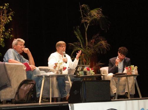 Vincent Rebérioux (Ligue des droits de l’homme) animant la table ronde avec Catherine Wihtol de Wenden (CNRS) et François Héran (démographe)