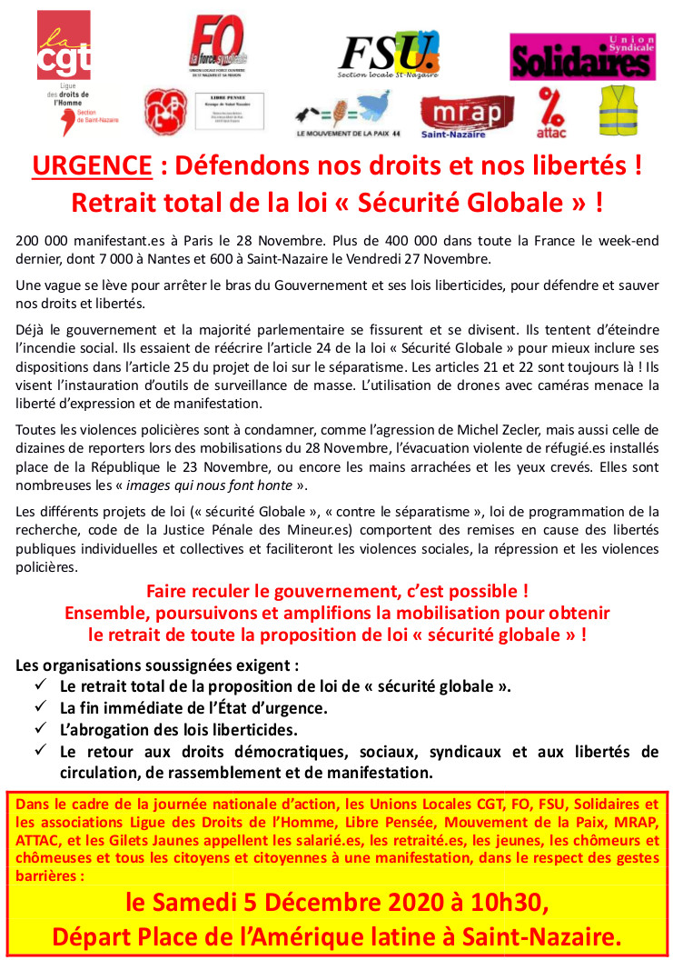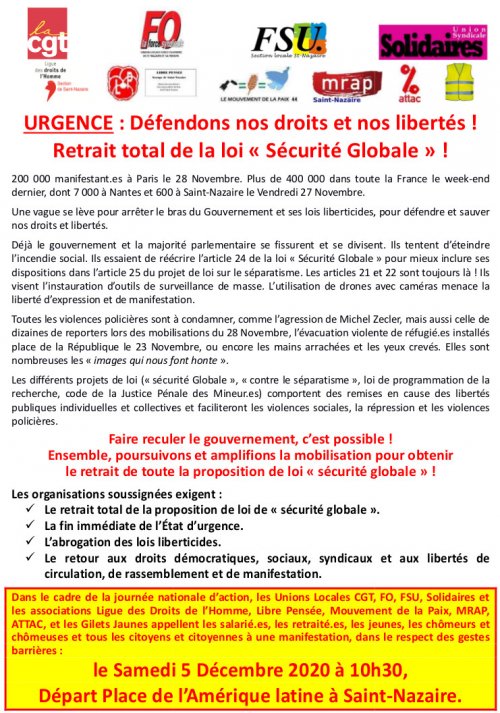 Accueil > Vivre ensemble > Défendons nos droits et libertés ! Retrait total de la loi "Sécurité Globale"