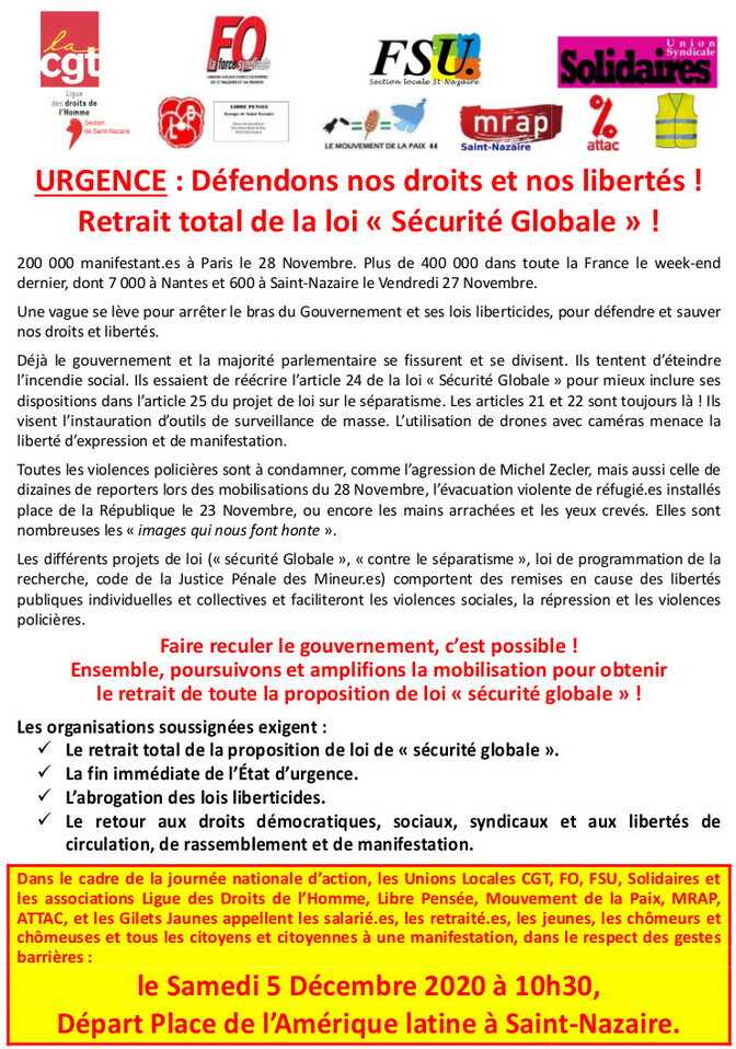 Défendons nos droits et libertés ! Retrait total de la loi "Sécurité Globale"