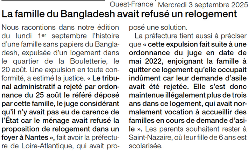 Dans l’édition du 3 septembre de Ouest-France, la préfecture réagit à nos refus des expulsions sans relogement d’urgence pour les familles déboutées du droit d’asile. Elle revient sur la situation d’une famille du Bangladesh.