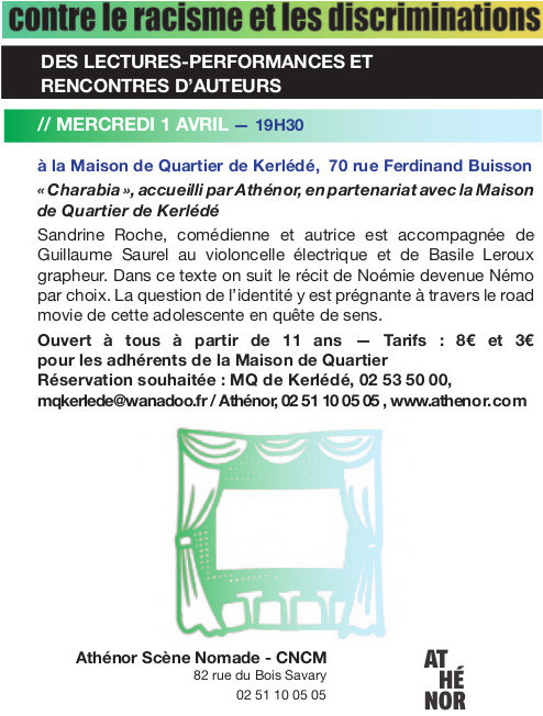 A la maison de Quartier de Kerlédé, lecture avec Sandrine Roche, organisée par Athénor, scène monade