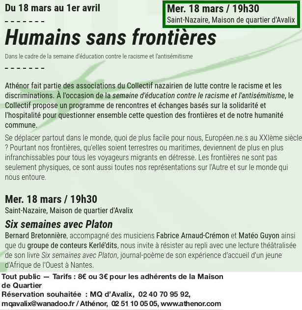 Accueil > Contre le racisme > Education contre le racisme > [Humains sans frontières] Lecture théâtralisée : Six semaines avec Platon