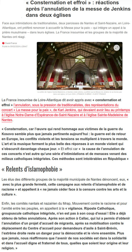 Deux églises de Nantes et Saint-Nazaire devaient accueillir la ’messe pour la paix’ de Karl Jenkins, compositeur et musicien gallois. Ces concerts sont portés par la Schola Cantorum de Nantes et des chorales locales. Cette messe inclut, aux côtés des psaumes, un appel islamique à la prière commune. C’est sans doute ce qui a déplu à ’Riposte catholique’, groupuscule intégriste catholique. Sous la pression et face aux intimidations, les organisateurs ’craignant que sa tenue n’engendre des violences’ ont préféré renoncer.
