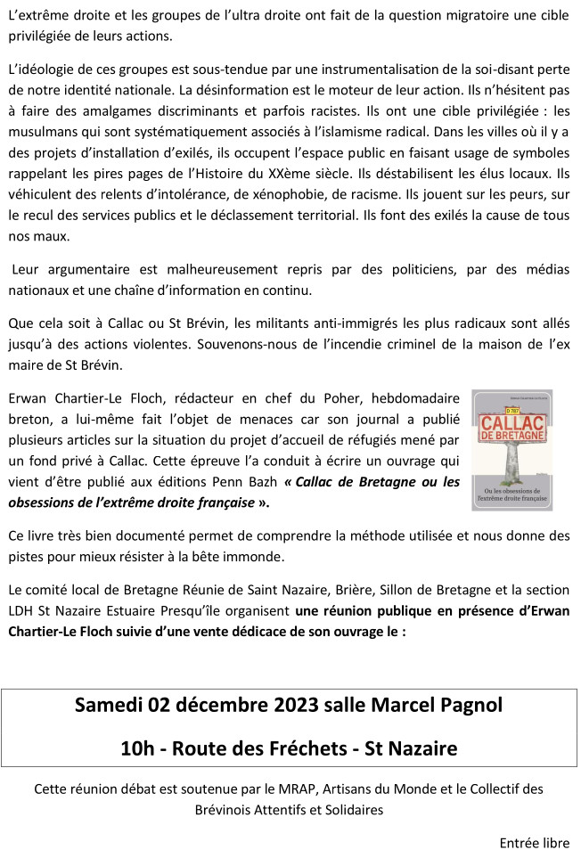 Le comité local de Bretagne Réunie de Saint Nazaire, Brière, Sillon de Bretagne et la section LDH St Nazaire Estuaire Presqu’île organisent une réunion publique avec Erwan Chartier-Le Floch, rédacteur en chef du Poher, hebdomadaire breton, auteur de "Callac de Bretagne ou les obsessions de l’extrême droite française".