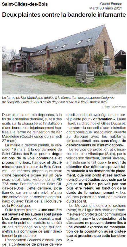 La LDH et le MRAP condamnent fermement les auteurs de la banderole comportant des propos haineux et discriminatoires visant à faire peur à la population de St Gildas des Bois suite au projet de dispositif de réinsertion géré par Sources d’envol, membre du mouvement Emmaüs dans la Ferme de Ker Madeleine.
