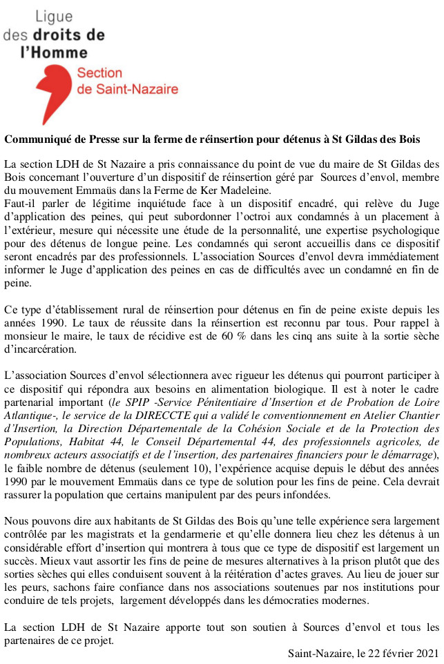 Nous publions ici le communiqué de la section locale de la LDH à propos de la ferme de réinsertion pour détenus de Saint—Gildas-des-Bois, gérée par Sources d’envol du mouvement Emmaüs et des inquiétudes que son installation suscite. Nous en partageons les termes.