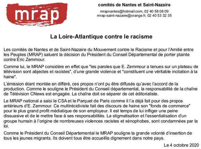 Les comités de Nantes et de Saint-Nazaire du Mouvement contre le Racisme et pour l’Amitié entre les Peuples (MRAP) saluent la décision du Président du Conseil Départemental de porter plainte contre Éric Zemmour.