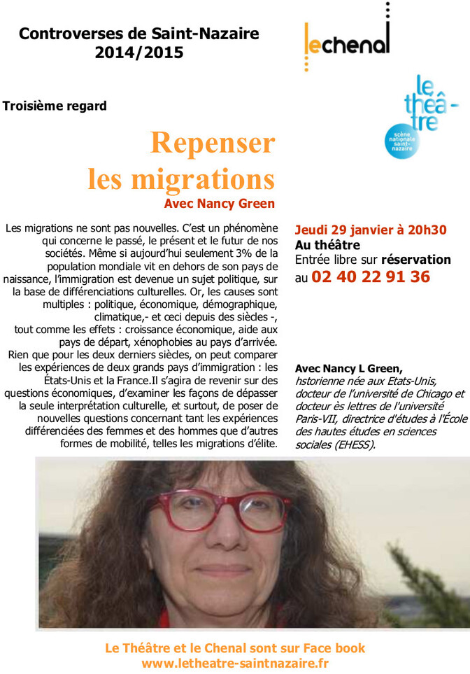Dans le cadre des "Controverses de Saint-Nazaire", Le Chenal organise un débat "Repenser les migrations" avec Nancy L. Green le 29 janvier.