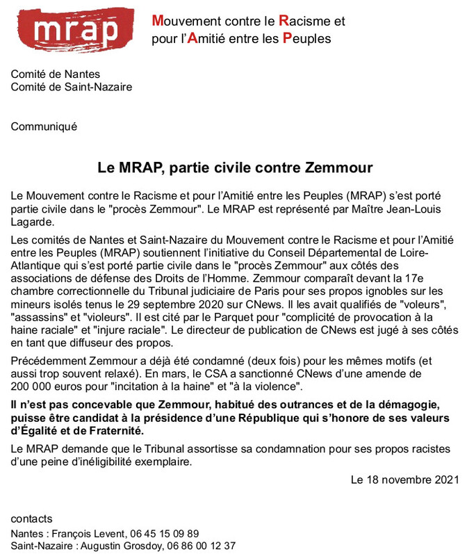Le Mouvement contre le Racisme et pour l’Amitié entre les Peuples (MRAP) s’est porté partie civile dans le "procès Zemmour".