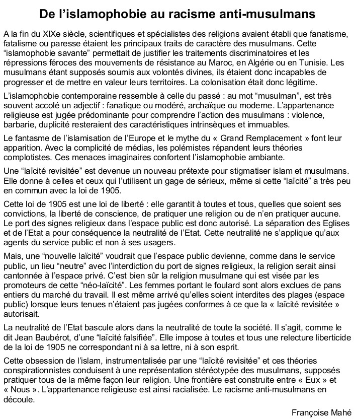 L’obsession de l’islam, instrumentalisée par une “laïcité revisitée” et les théories conspirationnistes conduisent à une représentation stéréotypée des musulmans.e., supposé.e.s pratiquer tou.te.s de la même façon leur religion. Une frontière est construite entre « Eux » et « Nous ». L’appartenance religieuse est ainsi racialisée. Le racisme anti-musulmans en découle.