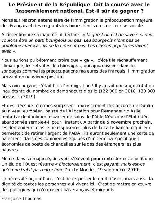 Monsieur Macron entend faire de l’immigration la préoccupation majeure des Français et des migrants les boucs émissaires de la crise sociale.[...]