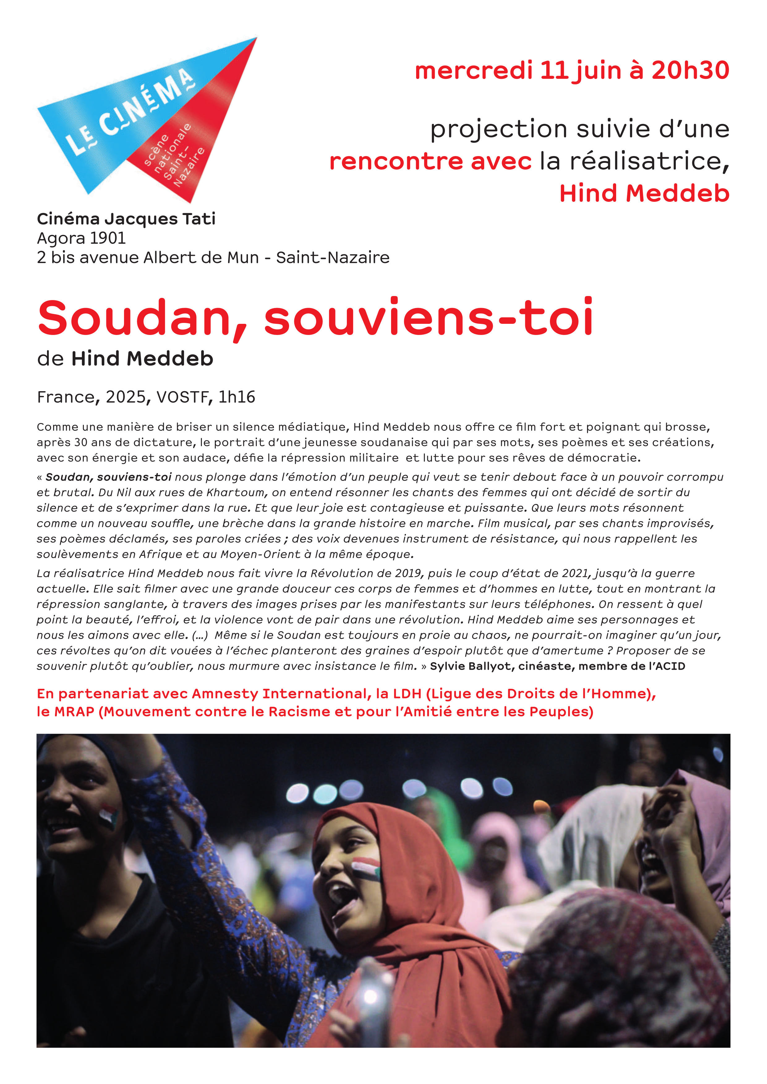 Le mercredi 11 juin (20h30) "Soudan, souviens-toi" sera projeté au cinéma Jacques Tati, en présence de Hind Meddeb, la réalisatrice, en partenariat avec Amnesty, la LDH et le MRAP. Des personnes soudanaises résidant à Saint-Nazaire seront également présentes pour partager leurs vécus.