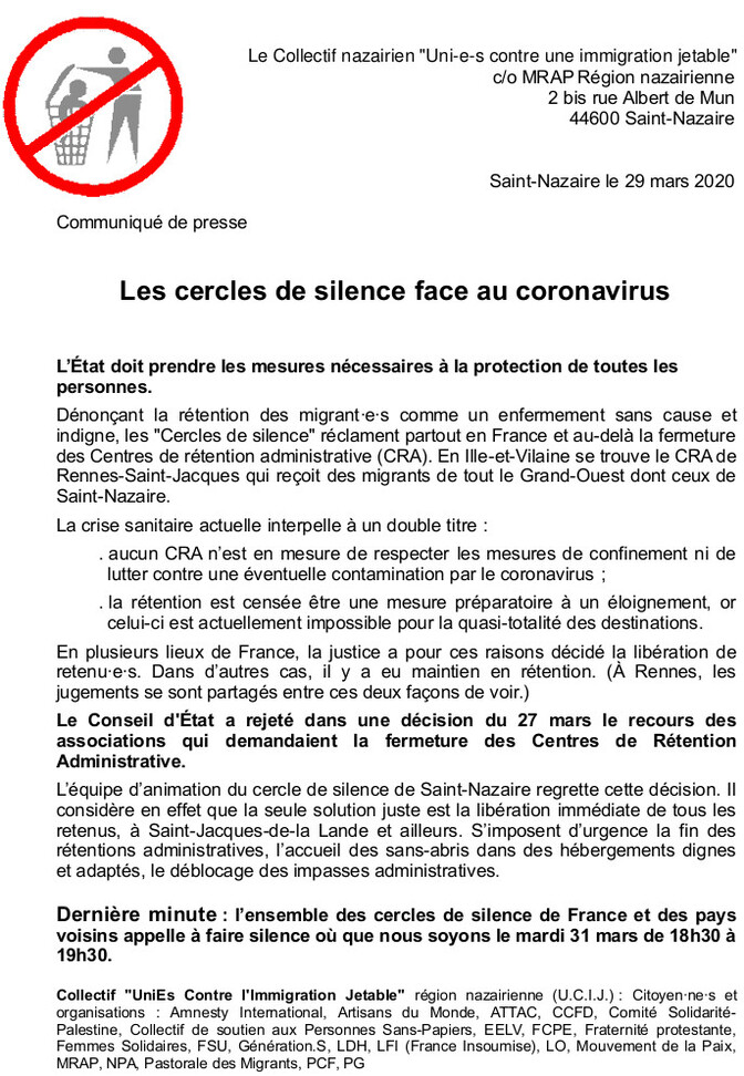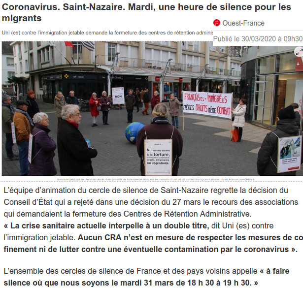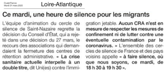Dernière minute : l’ensemble des cercles de silence de France et des pays voisins appelle à faire silence où que nous soyons le mardi 31 mars de 18h30 à 19h30.