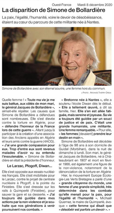Simone de Bollardière est décédée. Les peuples, de l’Algérie à la Palestine, perdent une amie et une défenseure déterminée de leurs droits.