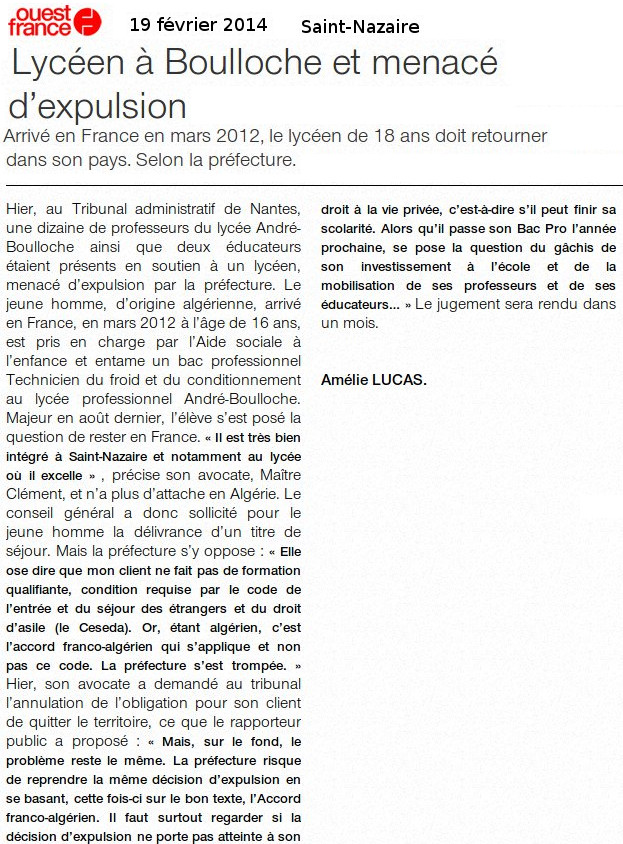 Lycéen menacé d’expulsionmercredi 19 février 2014
