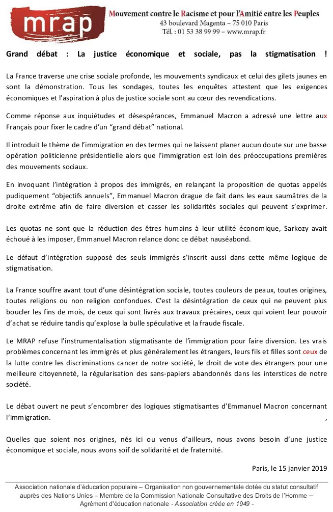 [MRAP] Grand débat : La justice économique et sociale, pas la stigmatisation !