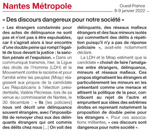 A la sortie d’une visite du commissariat de police de Nantes, Valérie Pécresse, candidate à l’élection présidentielle, accompagnée d’Eric Ciotti et de Laurence Garnier, élue nantaise et sénatrice, a déclaré : « Ils [les policiers] nous ont décrit une délinquance souvent étrangère, avec l’impossibilité de renvoyer chez eux des délinquants étrangers qui ont commis des délits chez nous (...) on voit des délinquants, des réseaux mafieux étrangers et des faux mineurs isolés qui commettent des délits à répétition puisqu’il n’y a pas de réponse judiciaire ». Presse-Océan, Ouest-France, 31 décembre 2021.