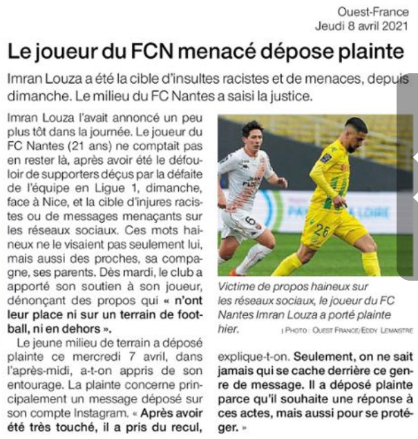 Les comités MRAP de Nantes et Saint-Nazaire, soutiennent Imran Louza, joueur du Football club de Nante, victime d’insultes racistes et de menaces. Il se tient à sa disposition pour se porter partie civile à ses côtés s’il le souhaite. Les auteurs de ces insultes et menaces doivent être identifiés, poursuivis en justice et condamnés.