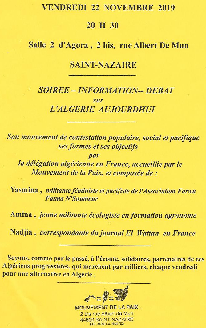 Depuis de nombreuses années la Mouvement de la Paix entretient des relations de solidarité et de partenariat avec l’Algérie. C’est dans ce cadre qu’une délégation algérienne, invitée par le Conseil National du Mouvement de la Paix, séjournera du 17 au 23 novembre en Bretagne. St-Nazaire aura la chance de l’accueillir pour une conférence le vendredi 22 novembre, à 20 heures 30, à Agora, 2Bis, rue Albert De Mun.