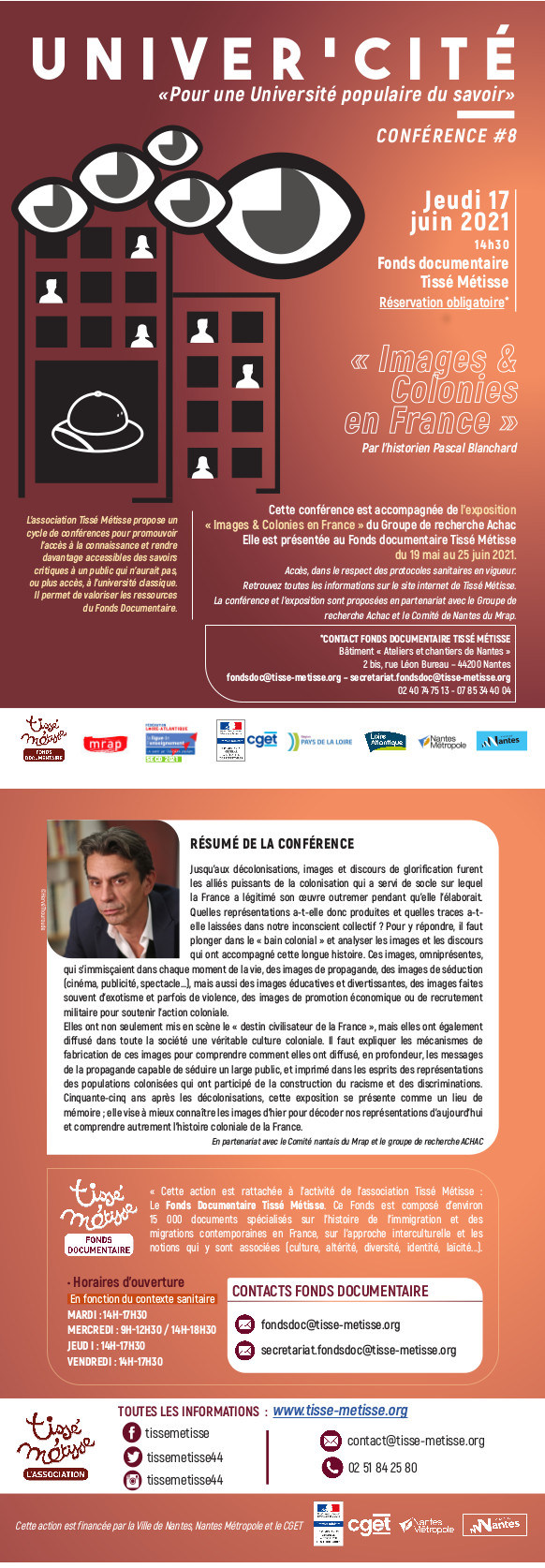 En raison des règles sanitaires en vigueur et de la jauge imposée par la mairie de Nantes (40 places), la réservation est obligatoire pour cette conférence : Tél. 02 40 74 75 13 et 07 85 34 40 04 ; secretariat.fondsdoc@tisse-metisse.org.