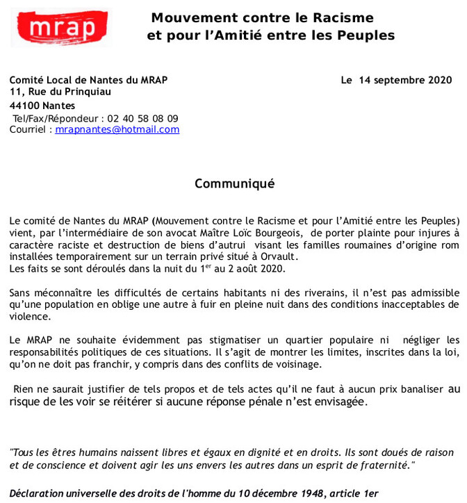 Alerté par les associations locales, le comité de Nantes du MRAP, membre actif du collectif Romeurope, adresse un signalement au procureur le 10 août, resté sans effet. Il décide début septembre par l’intermédiaire de son avocat maître Loïc Bourgeois de porter plainte pour injures à caractère raciste et destruction de biens d’autrui.