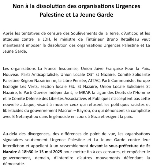 Non à la dissolution des organisations Urgence Palestine et la Jeune garde