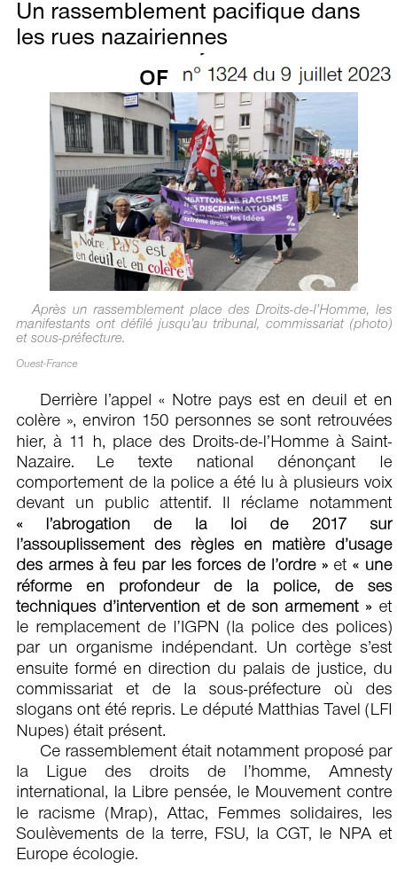 Sur cette base, à Saint-Nazaire, la FSU, Femmes Solidaires, l’UL CGT, Amnesty International, le NPA, la Libre Pensée, le MRAP, ATTAC, le Comité Citoyen Evolutif, Solidaires, EELV, LFI, les Gilets Jaunes, les Soulèvements de la Terre et la LDH appellent les citoyennes et les citoyens, les collectifs, les associations, organisations syndicales et organisations politiques à un