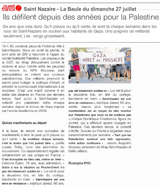 Le comité Solidarité Palestine de la région Nazairienne se félicite du succès de la manifestation de soutien au peuple Palestinien, qui s’est déroulée, samedi 19 juillet à Saint-Nazaire. Près de 180 personnes, de toutes cultures, beaucoup de jeunes notamment, ont défilé dans le calme avec pour chacun la Palestine au cœur.