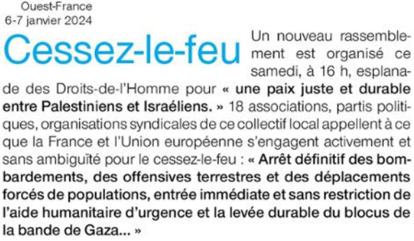 Nous demandons un cessez-le-feu immédiat à Gaza, la fin des bombardements, des offensives terrestres et des déplacements forcés de populations, ainsi que la levée immédiate du blocus. Nous exigeons que la France s’engage activement dans ce sens.