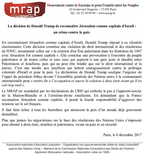 [Palestine] La décision de Donald Trump de reconnaître Jérusalem comme capitale d’Israël : un crime contre la paix