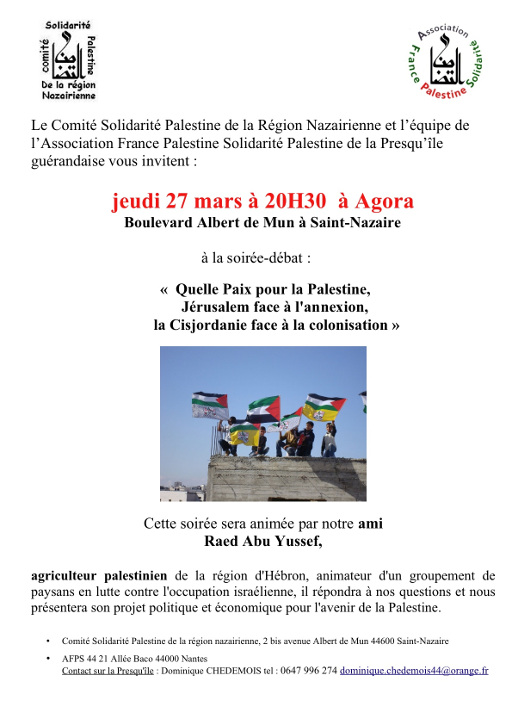 Jeudi 27 mars : "Quelle Paix pour la Palestine, Jérusalem face à l’annexion, la Cisjordanie face à la colonisation"