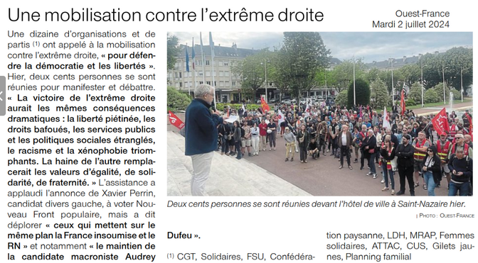 Ensemble, contre l’extrême droite, nous en appelons à la mobilisation citoyenne, pour défendre la démocratie et les libertés et à en débattre lundi 1er juillet, à 18h30, place de la Mairie