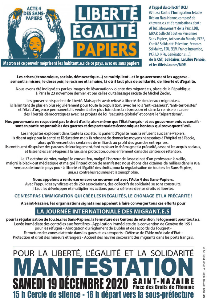 A l’appel du collectif UCIJ, de la CGT, Solidaires, la Libre Pensée, le Gilets jaunes/MDP, pour la journée internationale des migrants