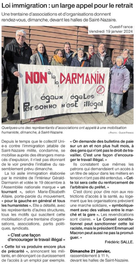 Organisations signataires : Accueil fraternel Loire et Sillon, ATTAC, Amnesty International, Artisans du Monde, Collectif des Brévinois Attentifs et Solidaires, CCFD-Terre solidaire, CUS, EELV, élus Ensemble, Solidaires et Écologistes, FCPE, FSU, LDH, LFI, Libre Pensée, LO, Mouvement de la Paix, MRAP, NPA, PCF, PRCF, Place Publique 44, Planning familial 44, PS Saint-Nazaire, Secours catholique, Solidarité Estuaire, UCIJ, UL CFDT, UL CGT, UL Solidaires