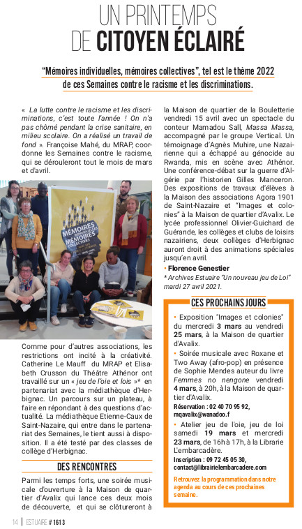 Les associations du Collectif nazairien de lutte contre le racisme et les discriminations vous proposent de participer à leurs rencontres et échanges sur le thème des « Mémoires individuelles, Mémoires collectives ».