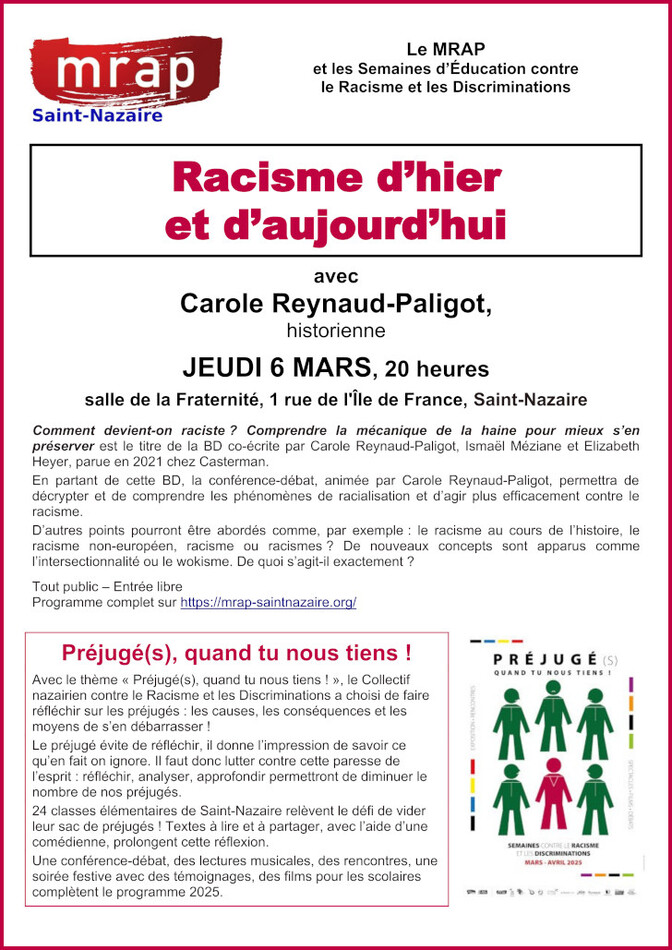 En partant de cette BD, la conférence-débat, animée par Carole Reynaud-Paligot, permettra de décrypter et de comprendre les phénomènes de racialisation et d’agir plus efficacement contre le racisme.