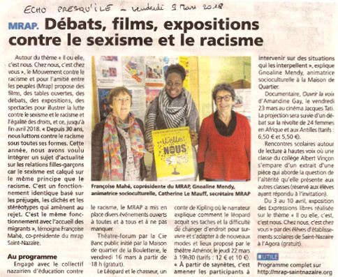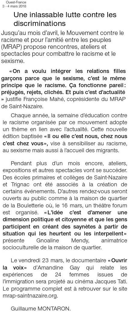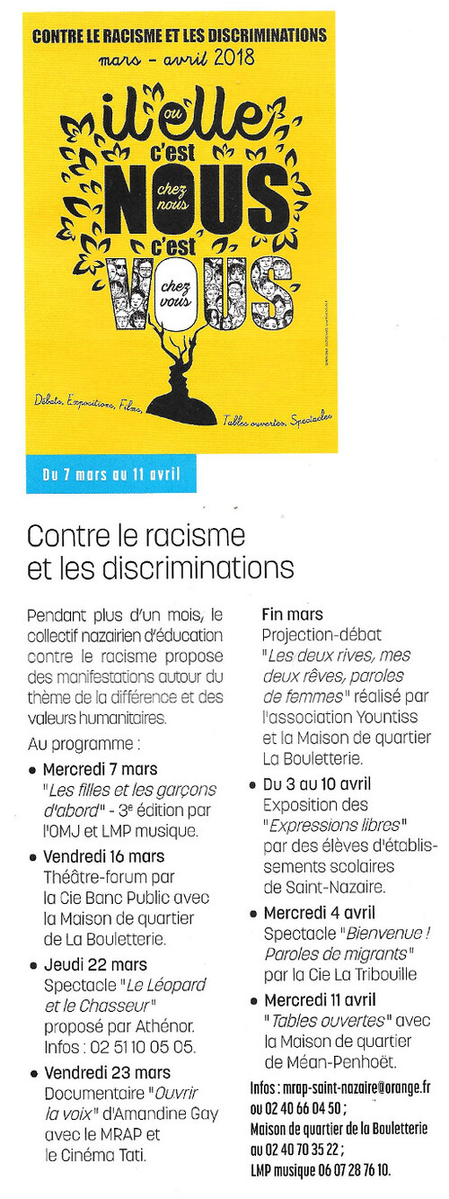 * : le MRAP, le Théâtre Athénor, la Compagnie des 3 Thés, les Maisons de Quartier de La Bouletterie et de Méan-Penhoët, l’OMJ, les collèges Albert Vinçon et Julien Lambot.