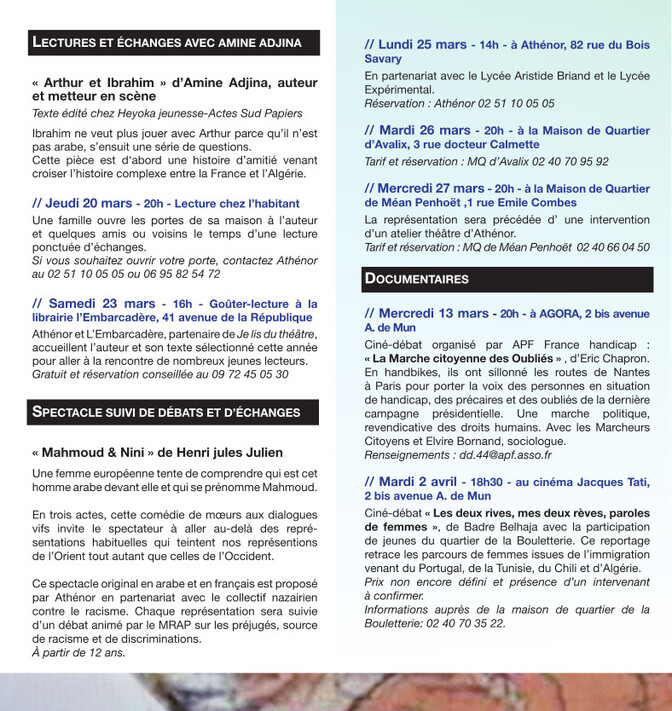 * le MRAP, Athénor, la Compagnie des 3 Thés, les Maisons de Quartier de La Bouletterie, de Méan-Penhoët, d’Avalix et de Kerlédé, Escalado, la Ligue de l’enseignement FAL44, les collèges Albert Vinçon et Julien Lambot.